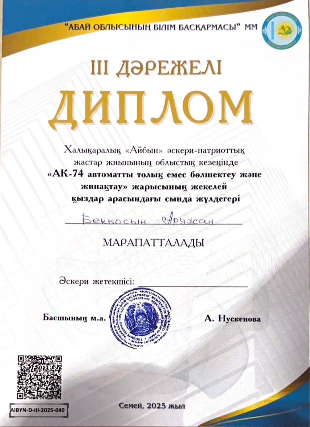 ✅2025 жылдың 16-18 сәуір аралығында Шүлбі кентінде «АЙБЫН-2025» әскери-патриоттық жастар жиынында әскери-қолданбалы спорт түрлерінен ОБЛЫСТЫҚ кезеңінде «АК-74 автоматты толық емес бөлшектеу және жинақтау» жекелей жарыста БЕКБОСЫН АРУЖАН жүлделі ІІІ-ОРЫНҒА ие болды.